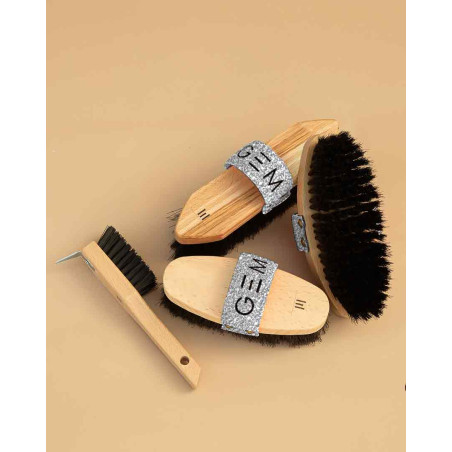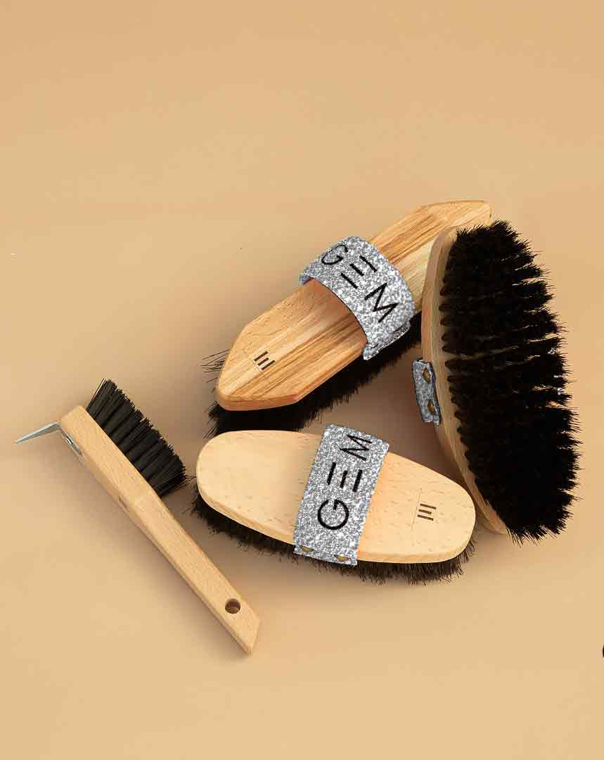 - La brosse poils longs : dotée de poils souples et longs, elle retire la dernière fine pellicule de poussière, et lustre parfaitement la robe de votre cheval.