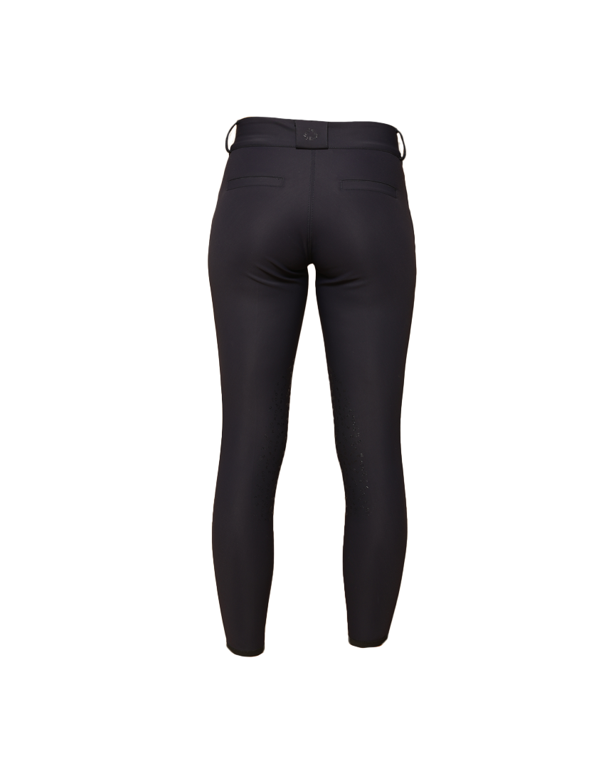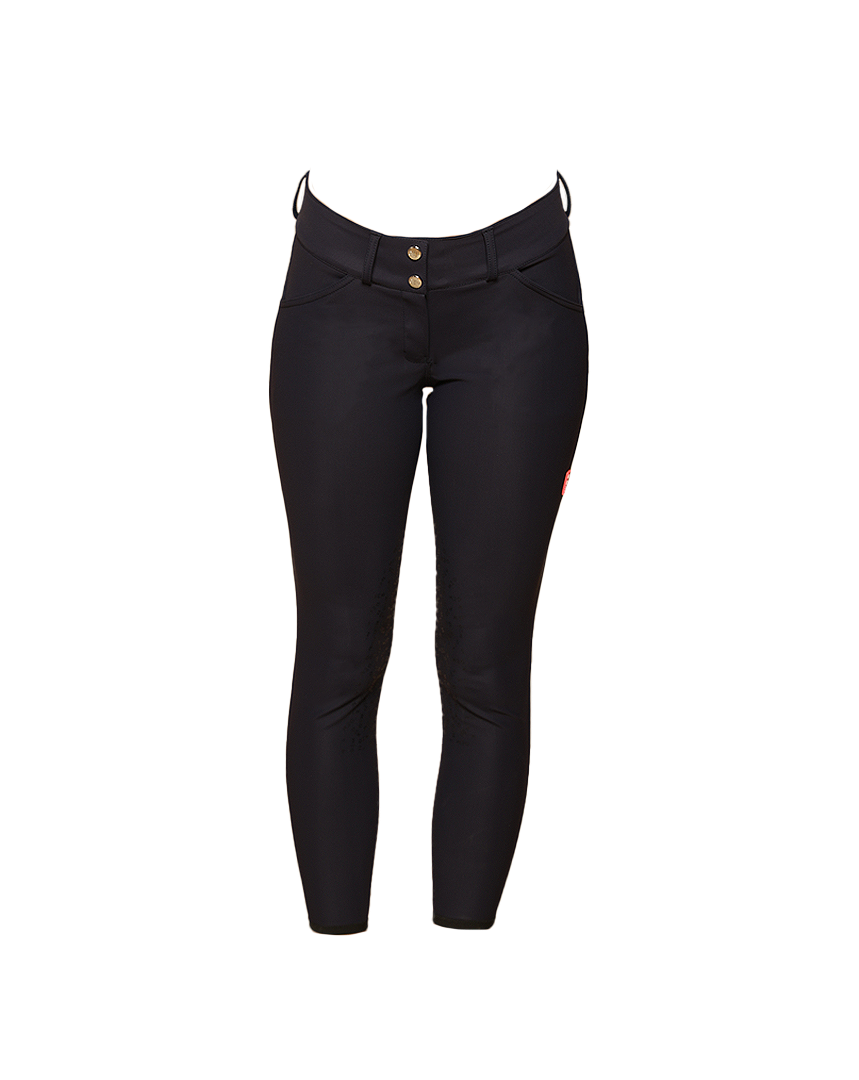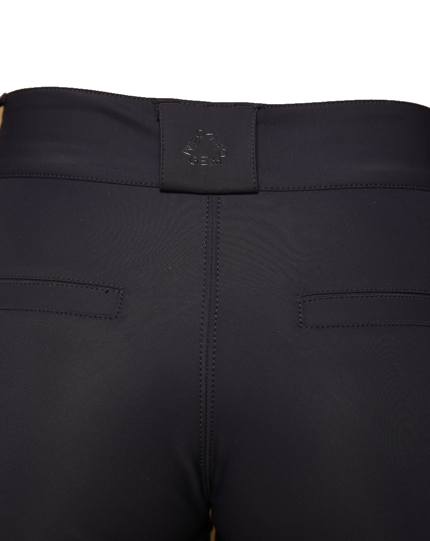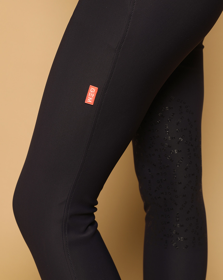 Pastille corail fluo sur la cuisse, logo GEM sur le passant arrière de la ceinture, les détails le subliment.