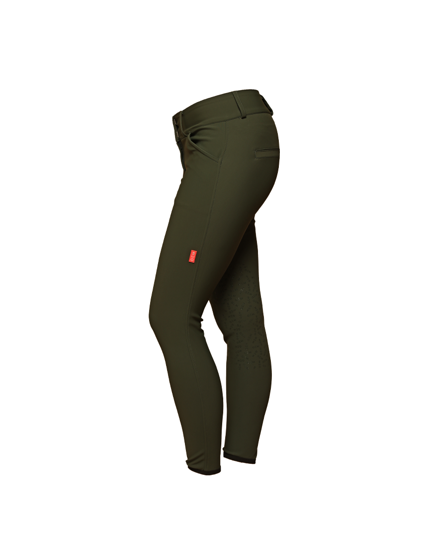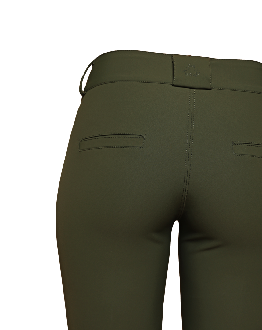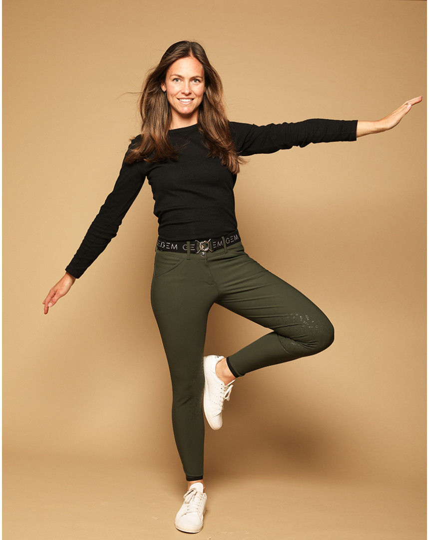 Pastille corail fluo sur la cuisse, logo GEM sur le passant arrière de la ceinture, les détails le subliment.