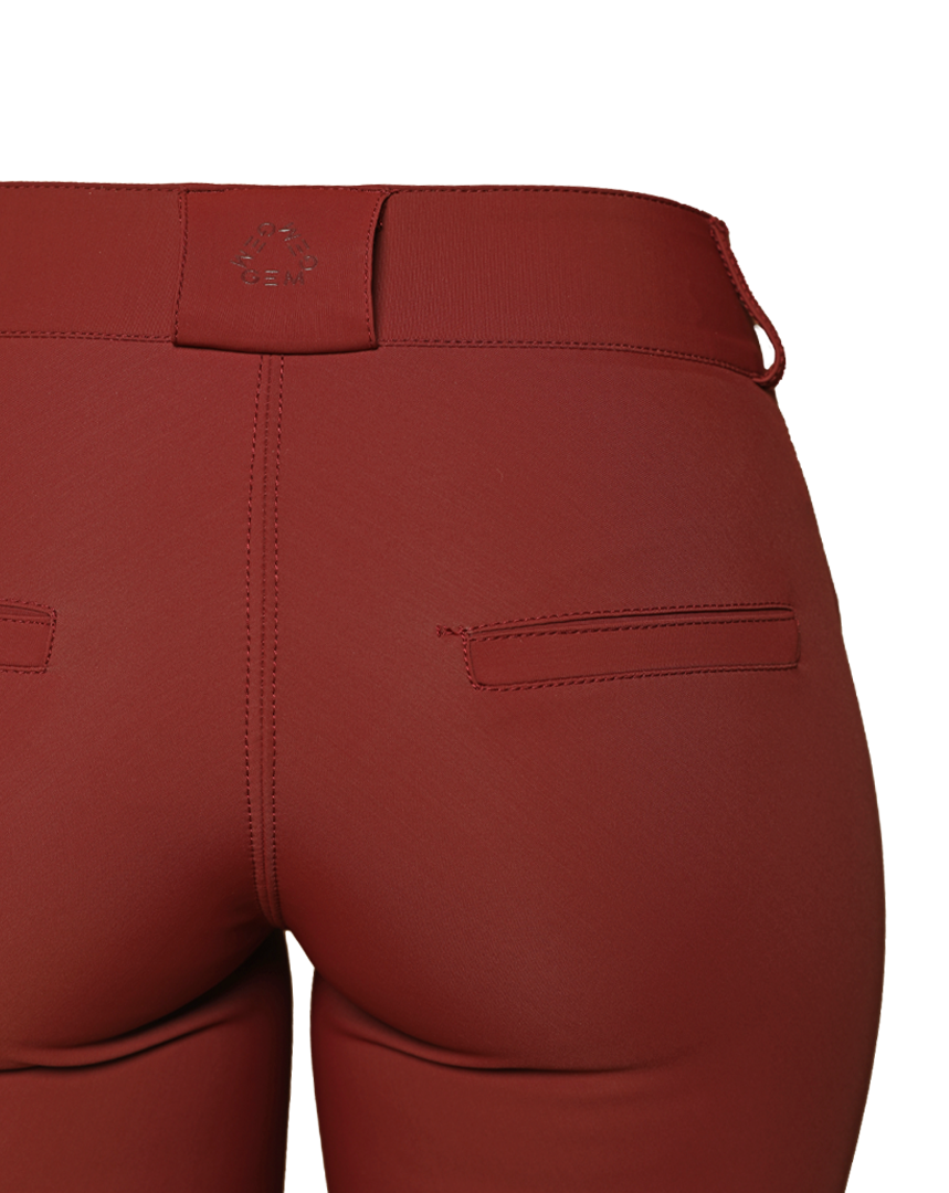 Pastille corail fluo sur la cuisse, logo GEM sur le passant arrière de la ceinture, les détails le subliment.