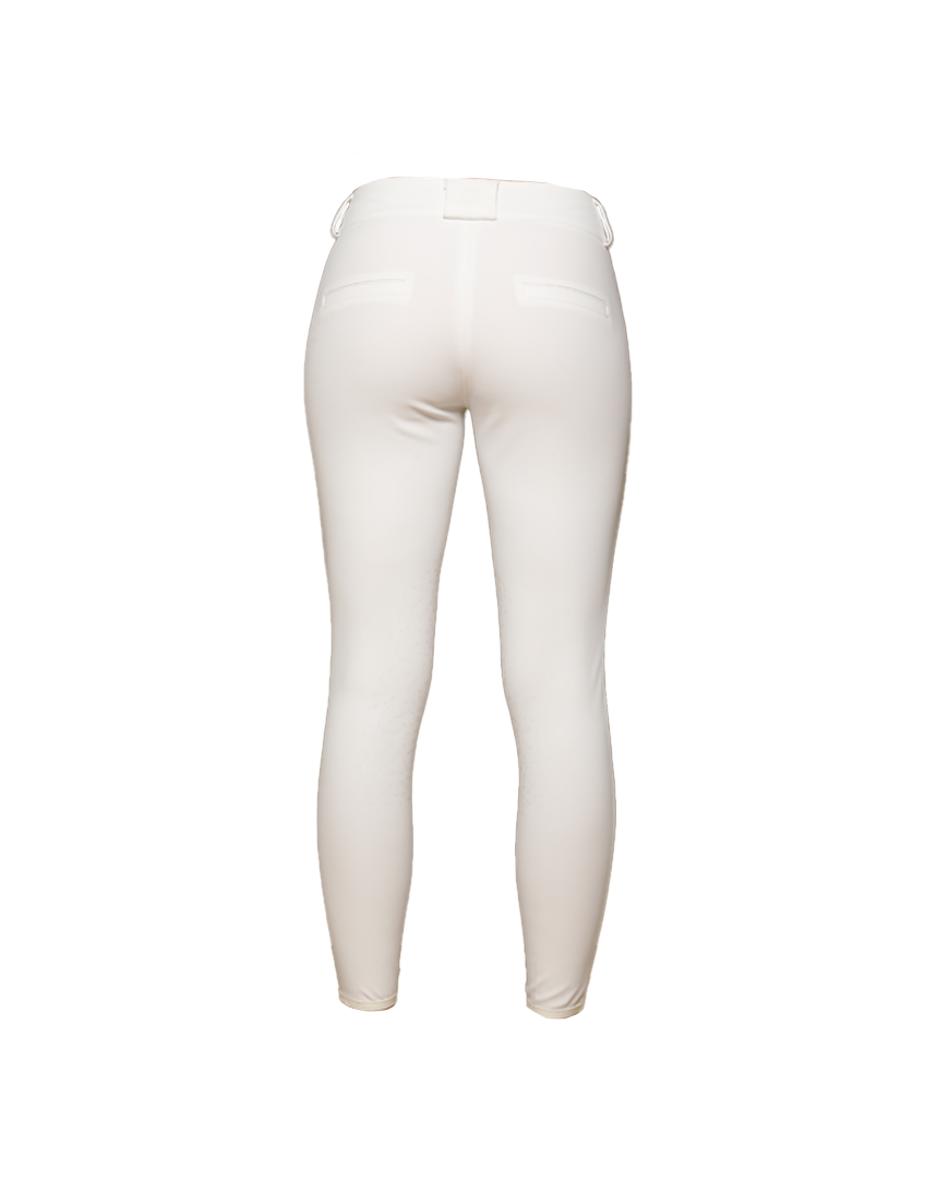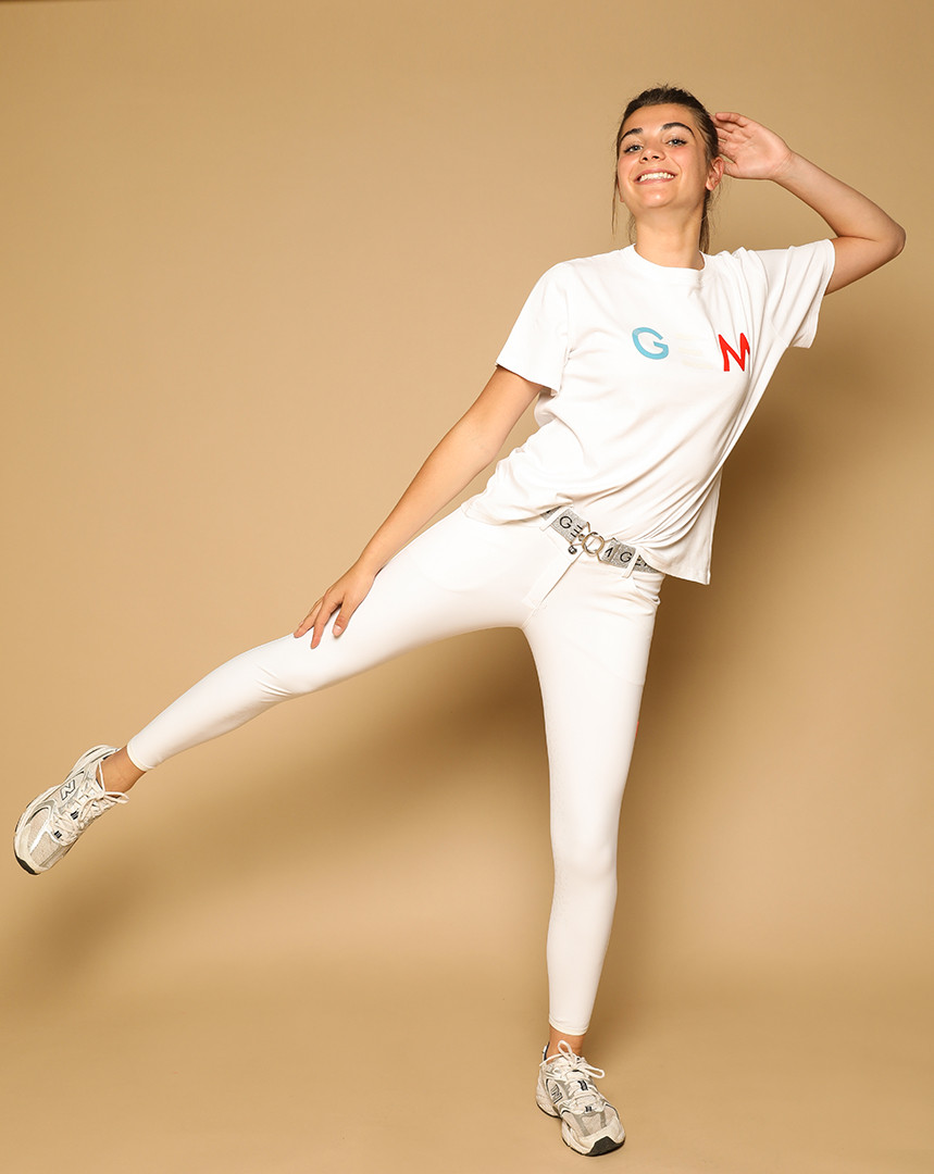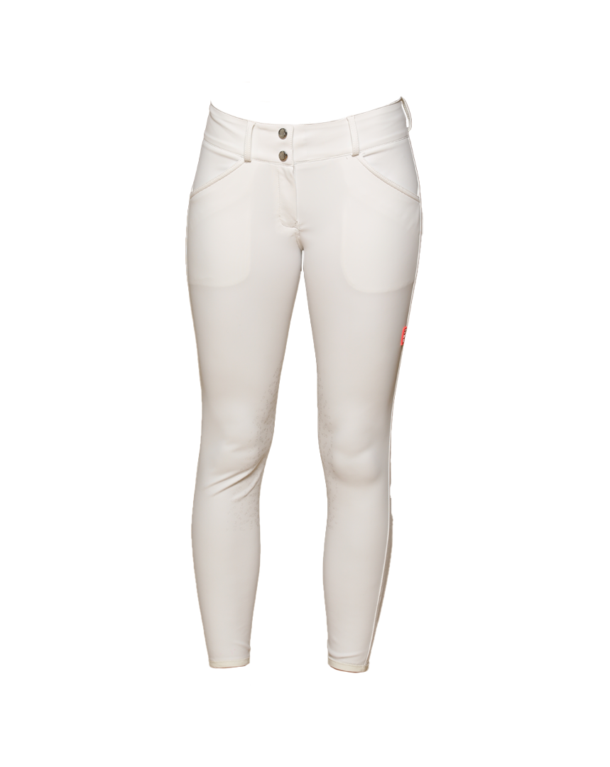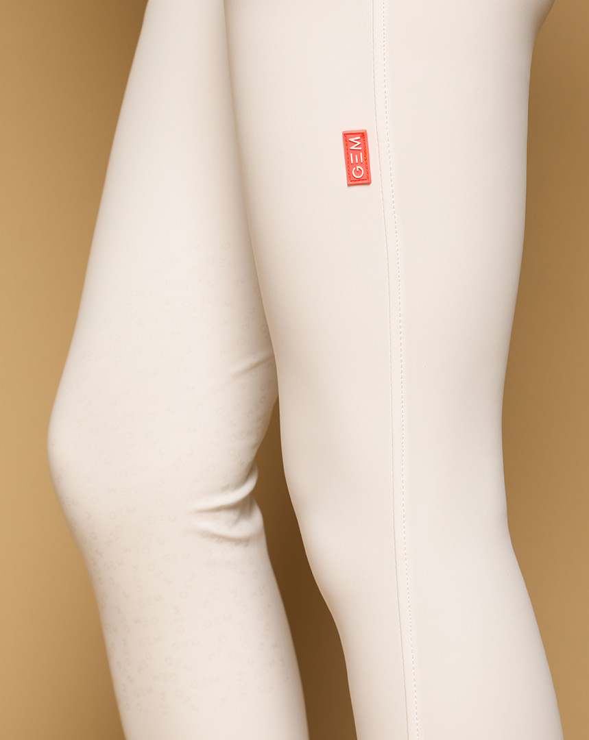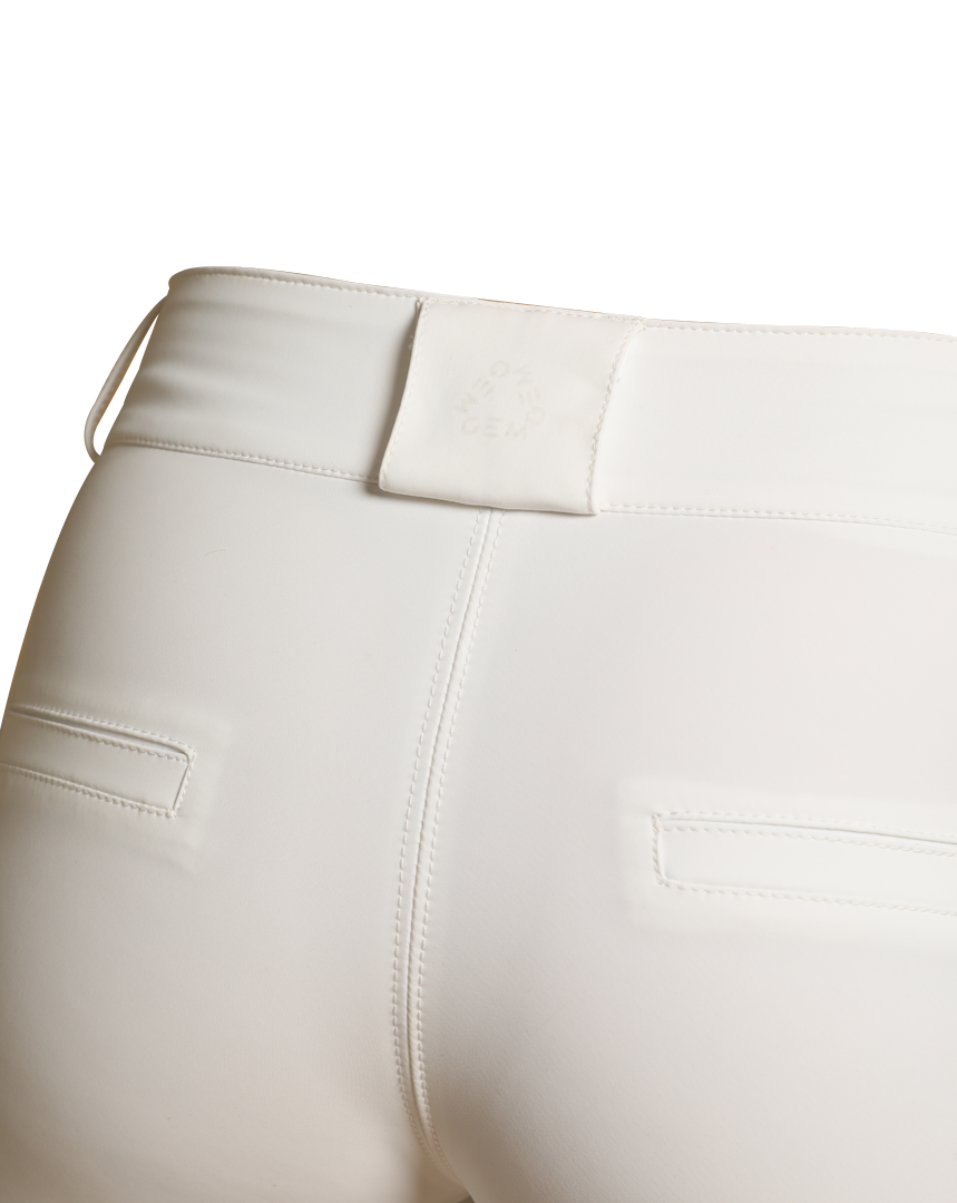 Pastille corail fluo sur la cuisse, logo GEM sur le passant arrière de la ceinture, les détails le subliment.