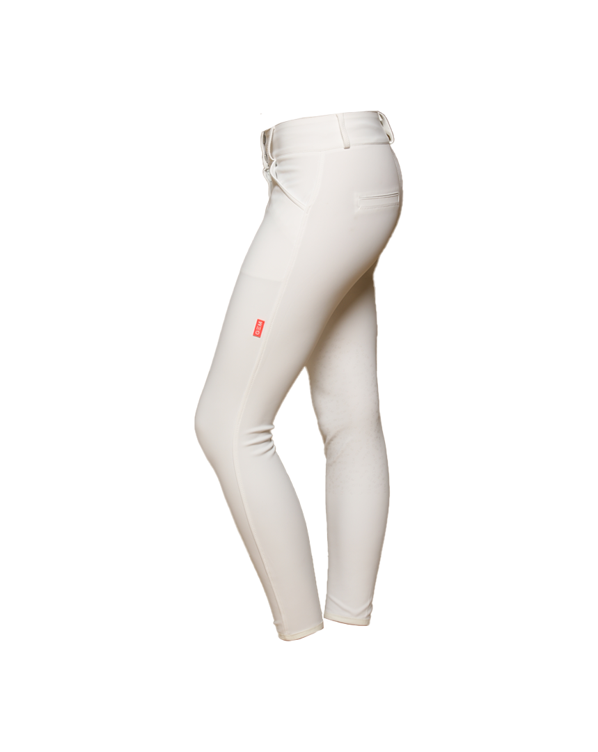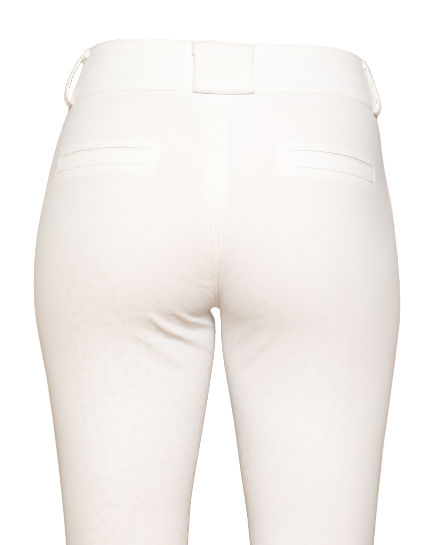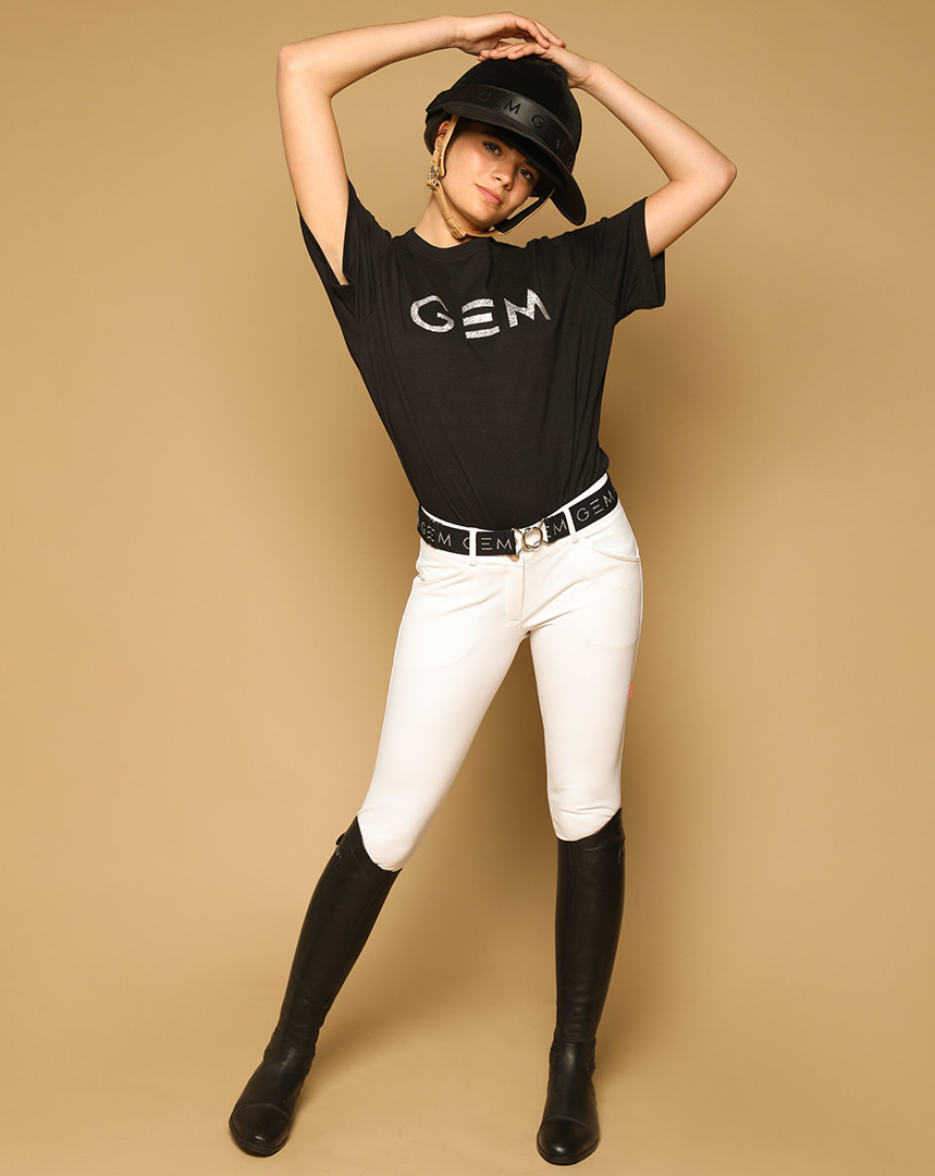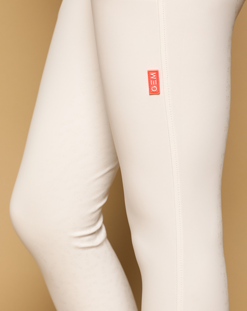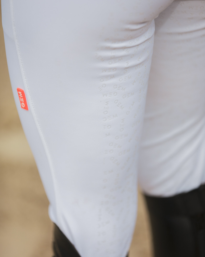 Pastille corail fluo sur la cuisse, logo GEM sur le passant arrière de la ceinture, les détails le subliment.