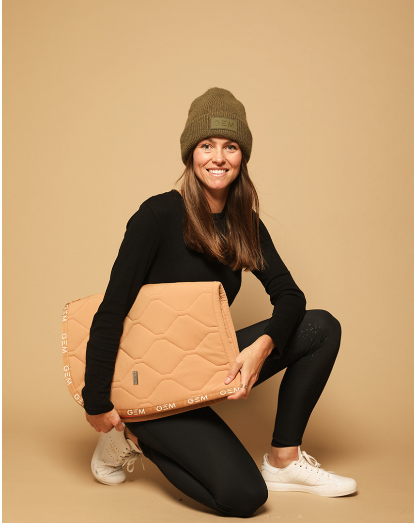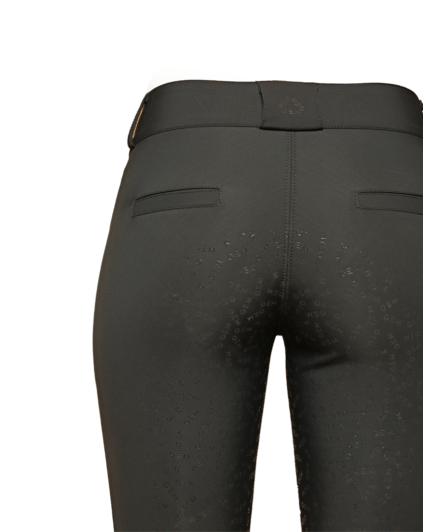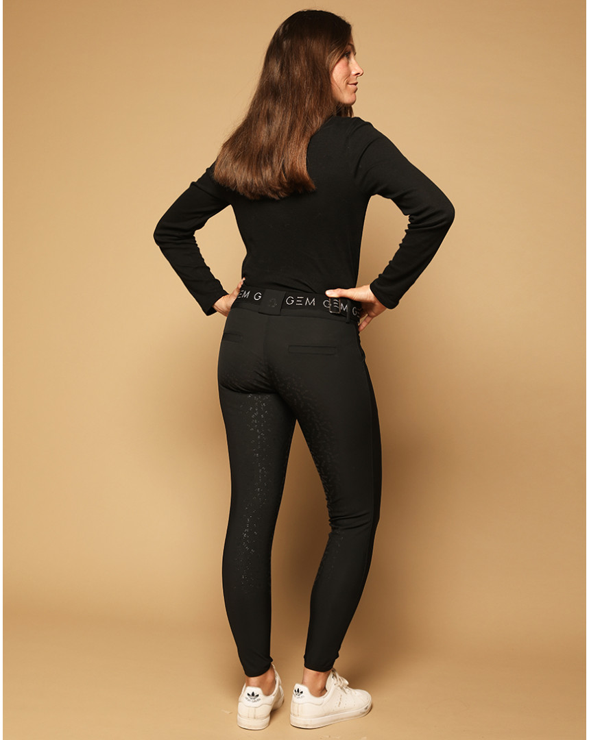 Pastille corail fluo sur la cuisse, logo GEM sur le passant arrière de la ceinture, les détails le subliment.