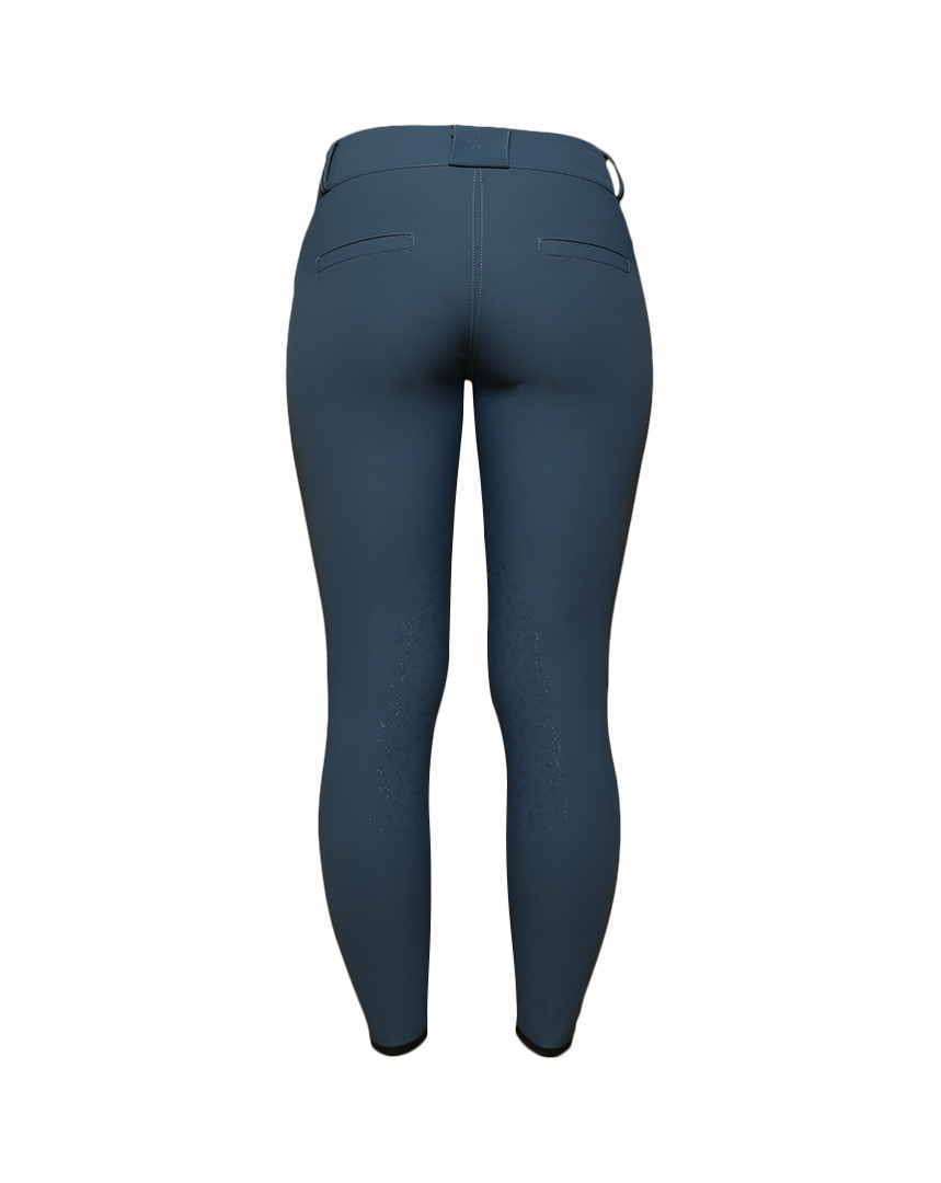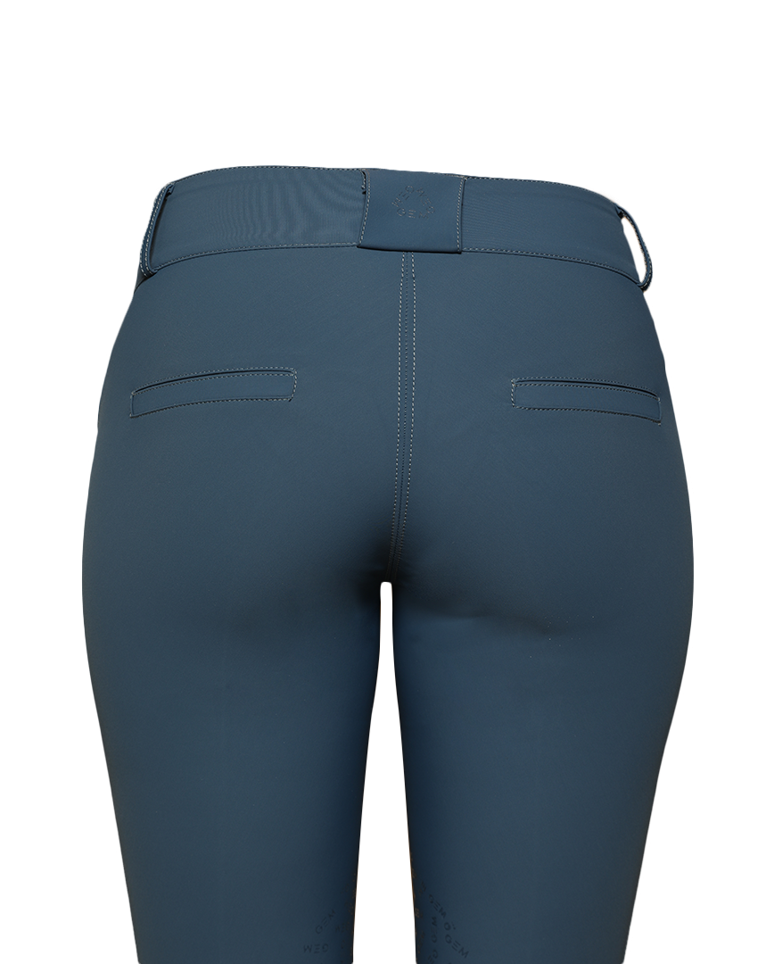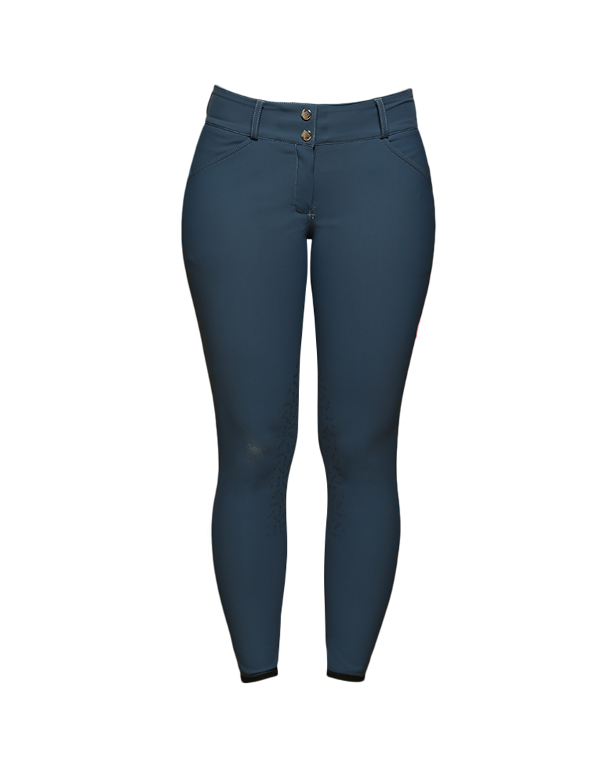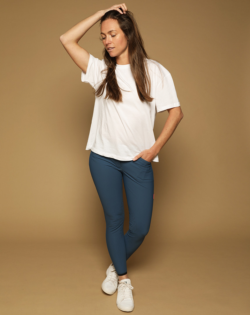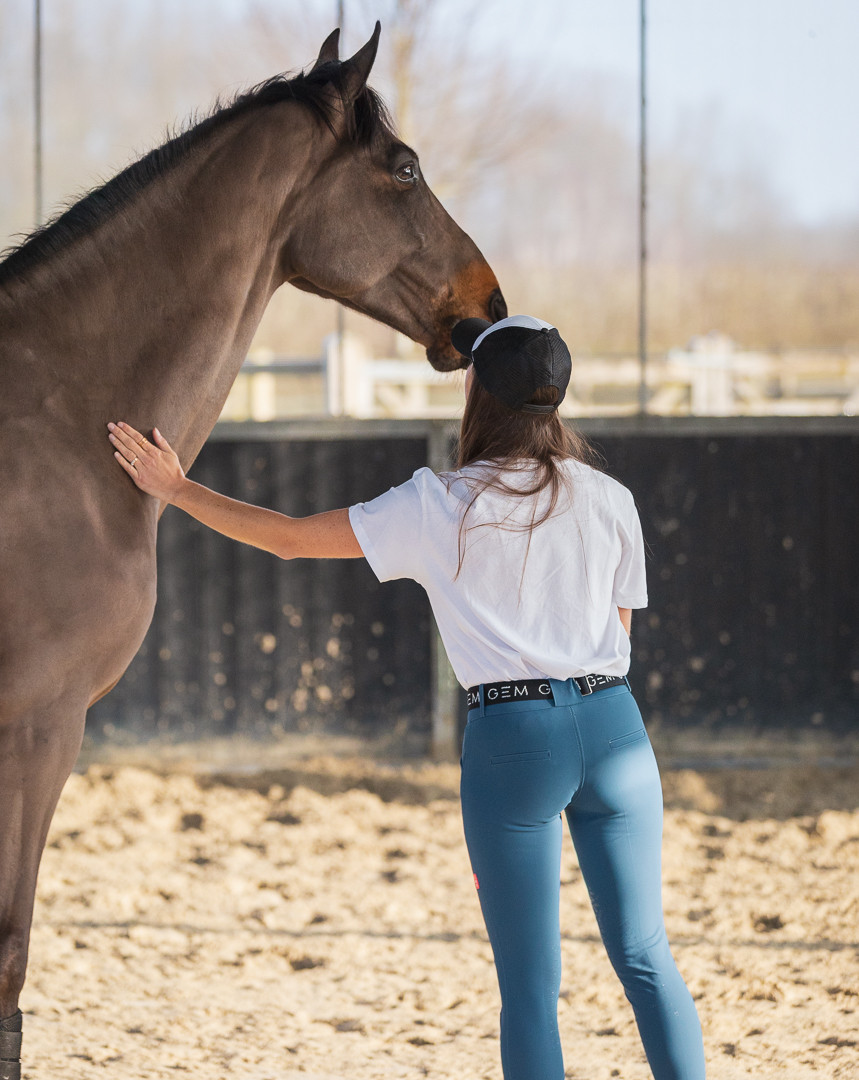 Pastille corail fluo sur la cuisse, logo GEM sur le passant arrière de la ceinture, les détails le subliment.