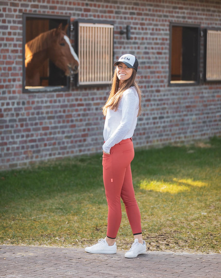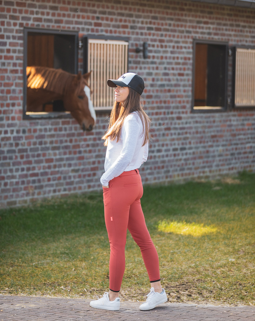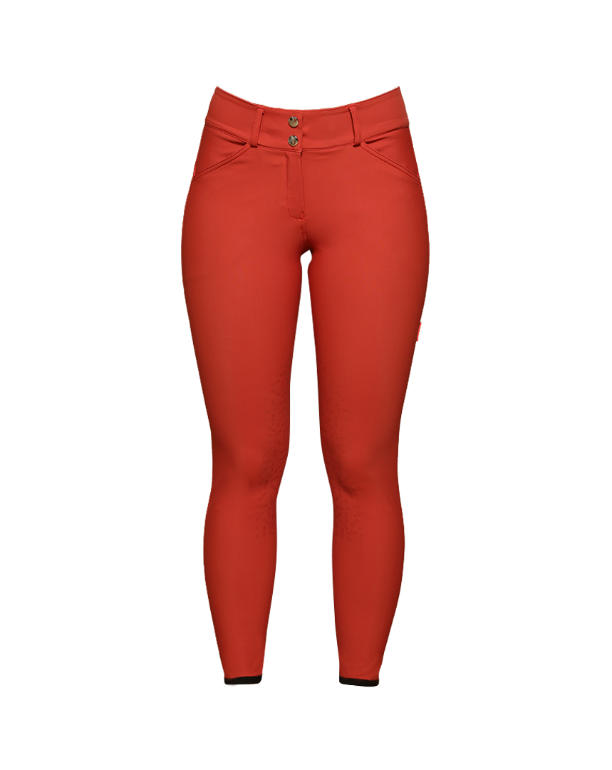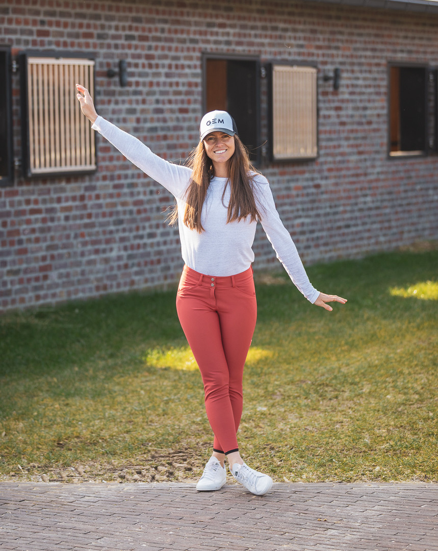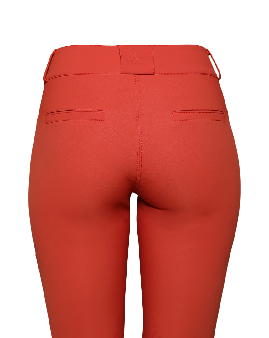 Pastille corail fluo sur la cuisse, logo GEM sur le passant arrière de la ceinture, les détails le subliment.