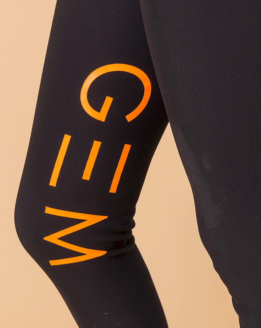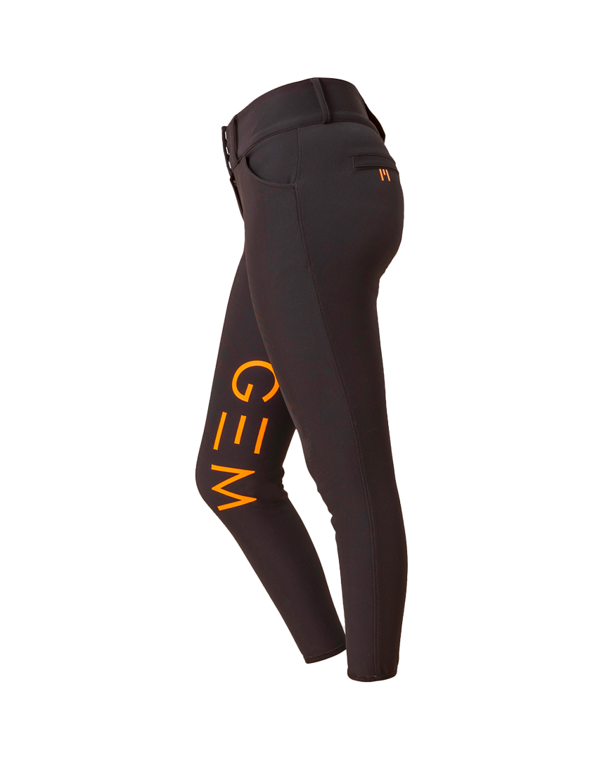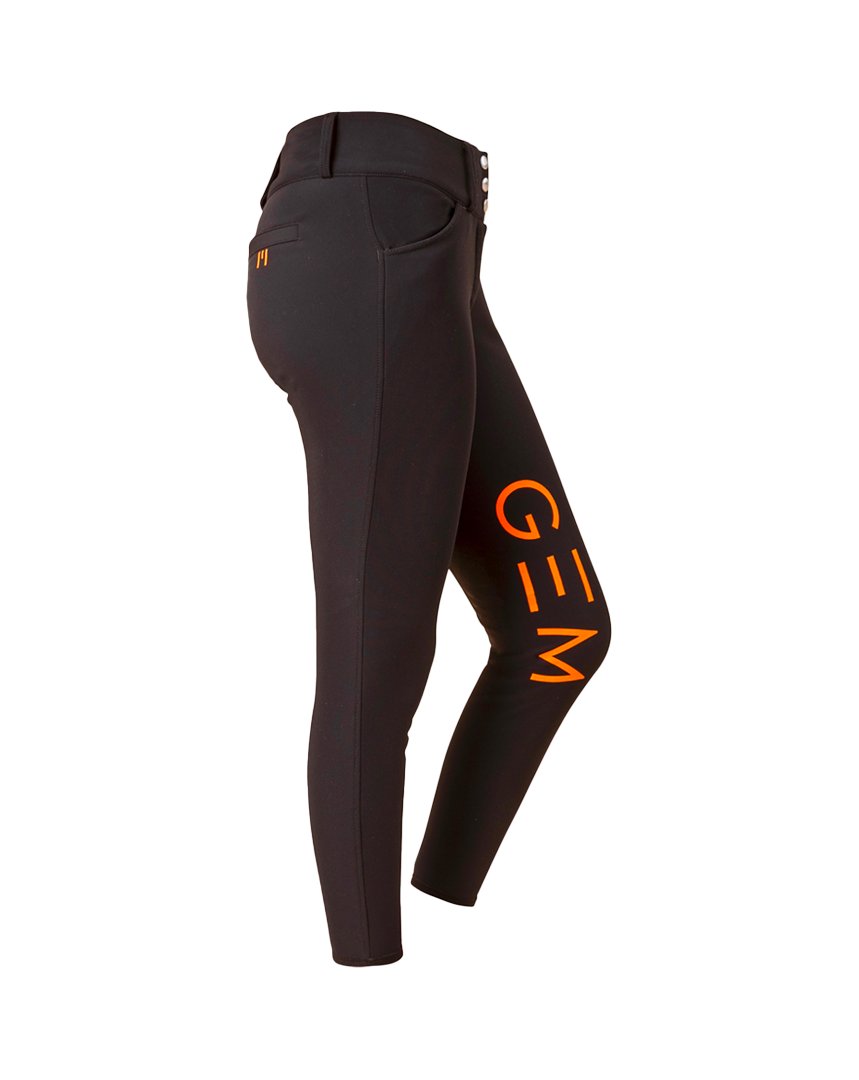 Grips GEM orange à l’intérieur des genoux, E de GEM sur chaque fesse, logo sur le passant arrière de la ceinture.