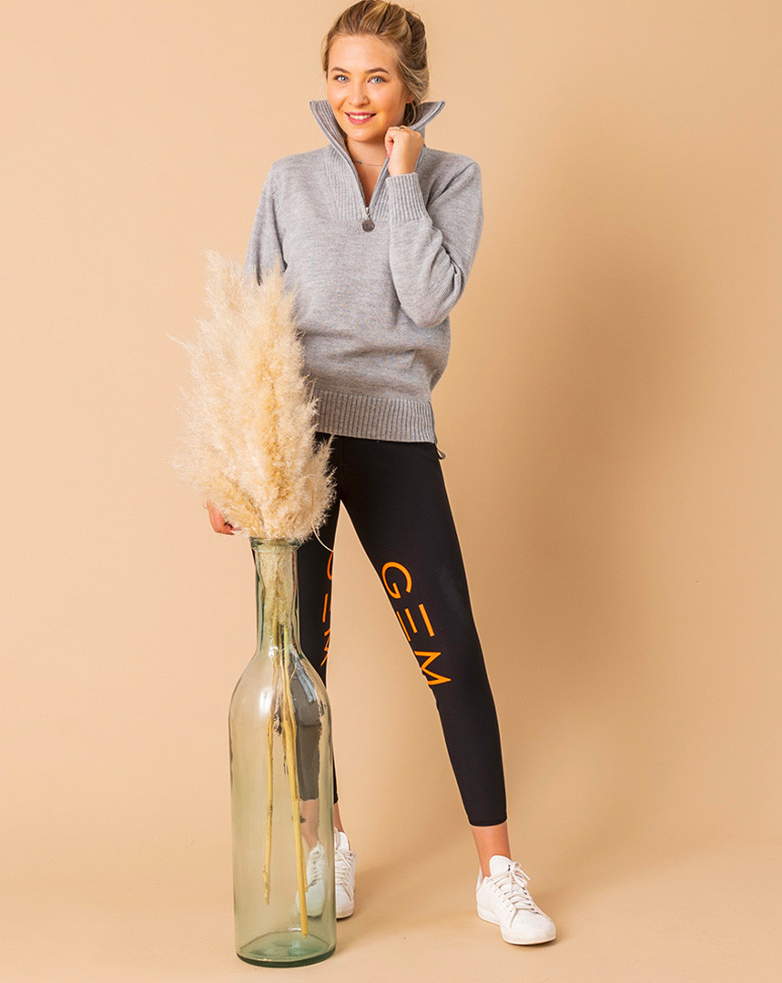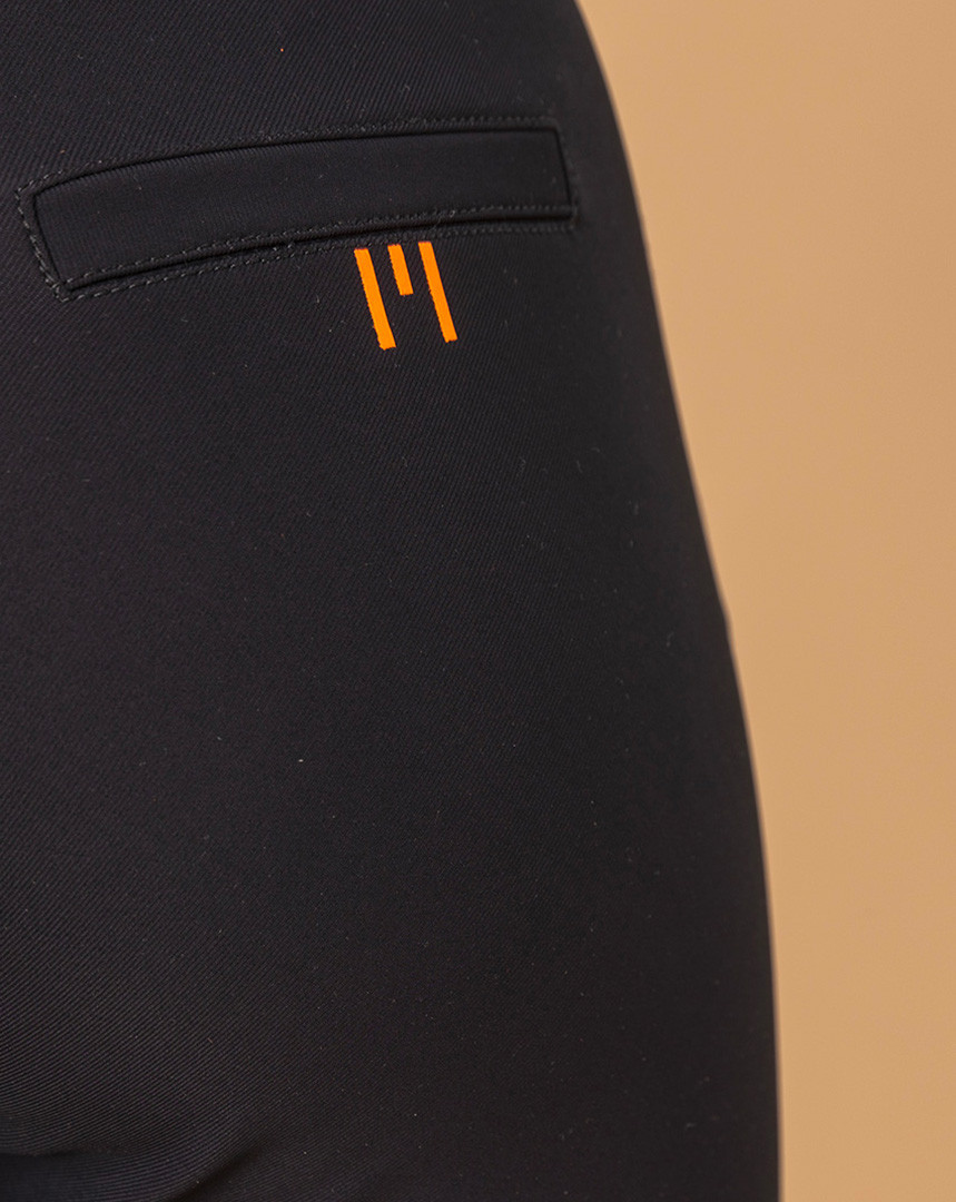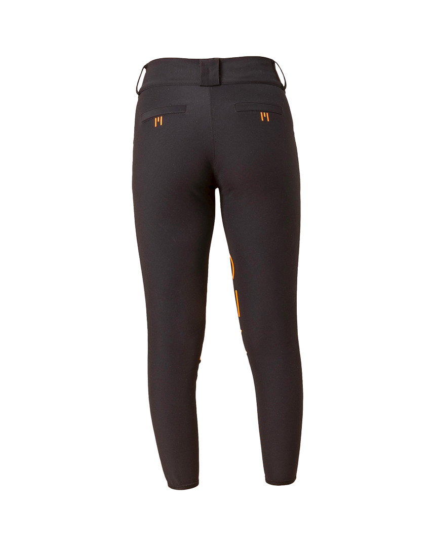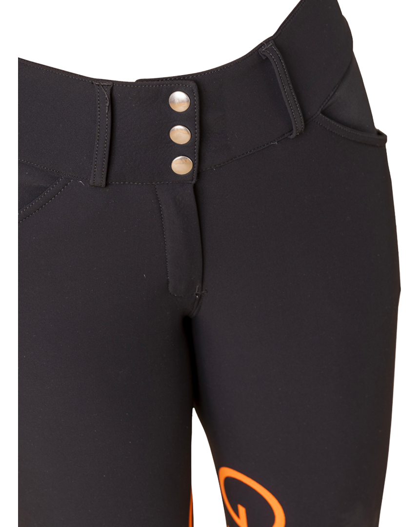 Grips GEM orange à l’intérieur des genoux, E de GEM sur chaque fesse, logo sur le passant arrière de la ceinture.