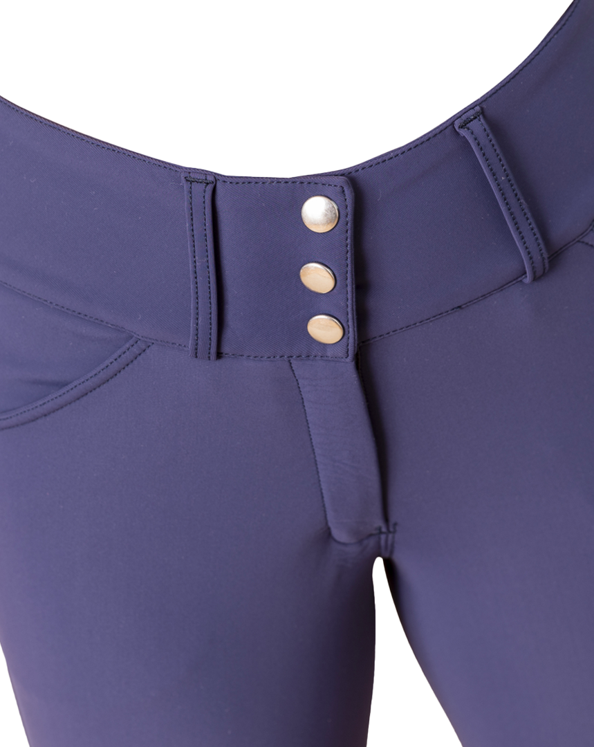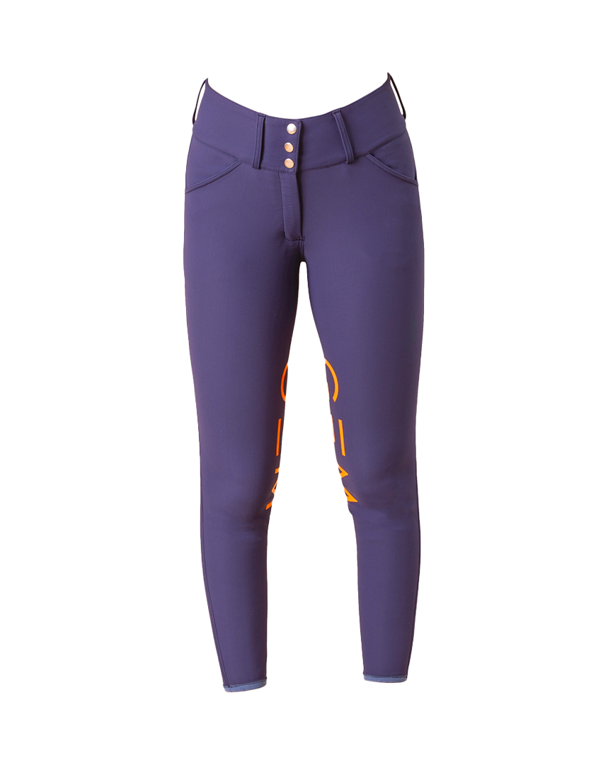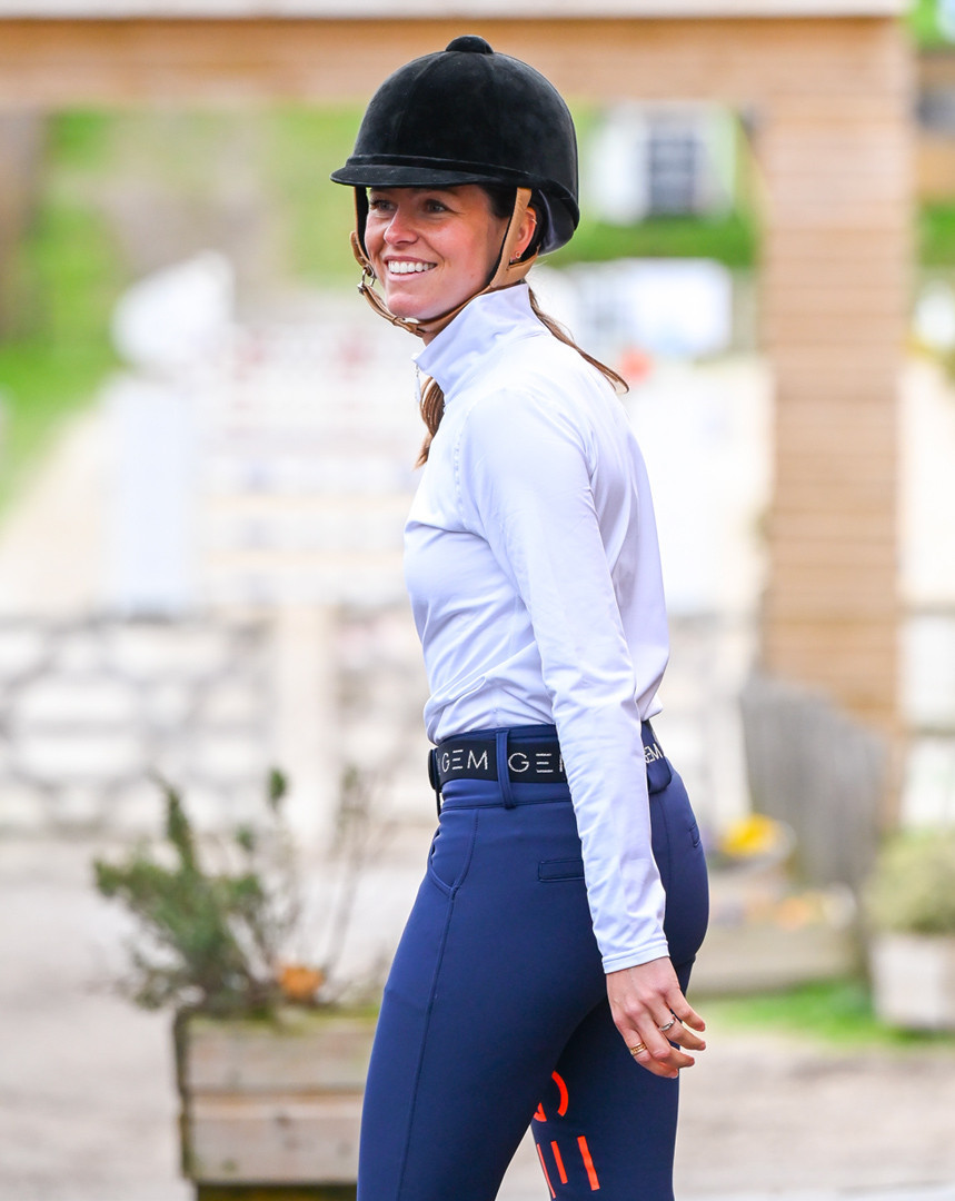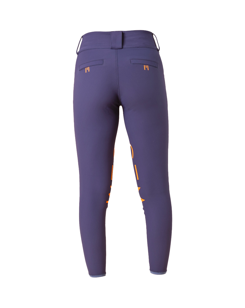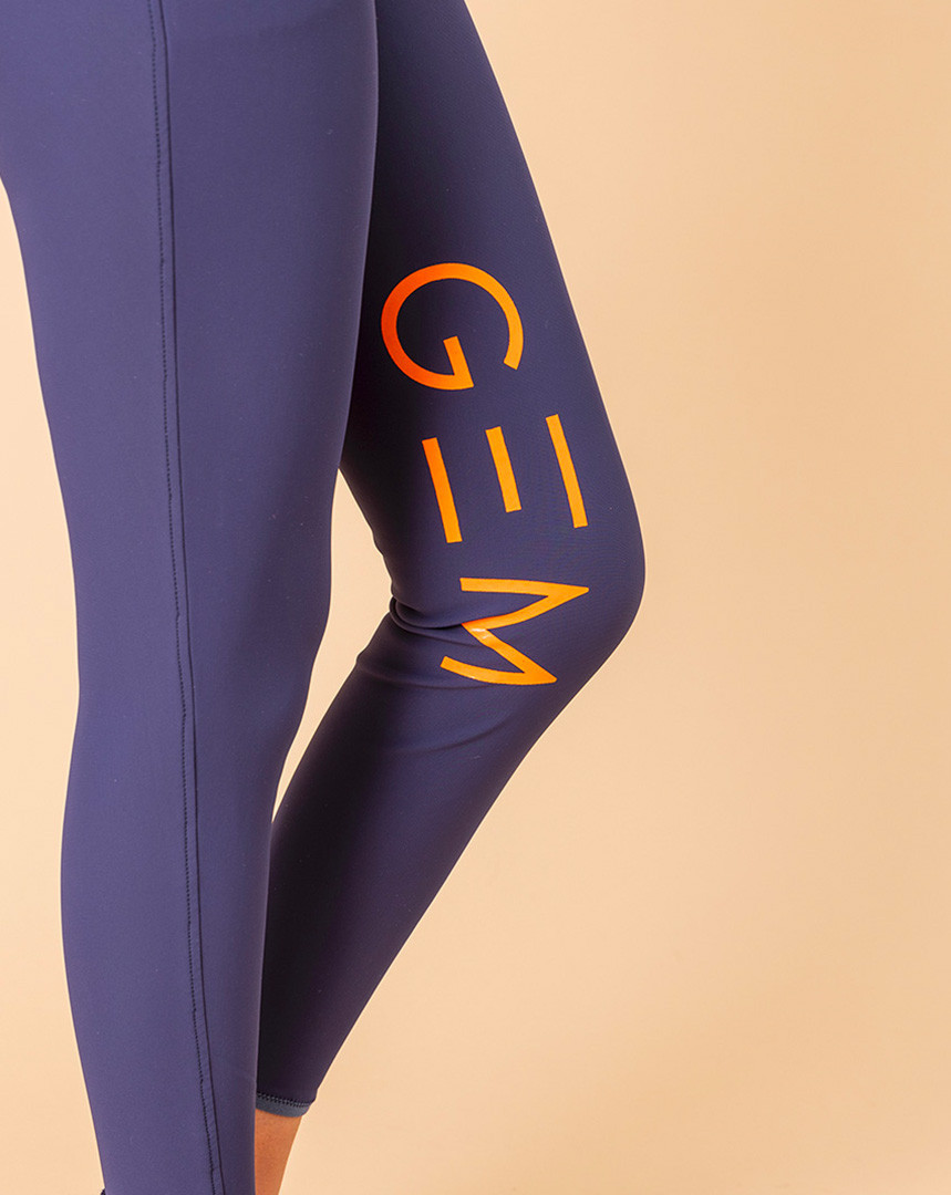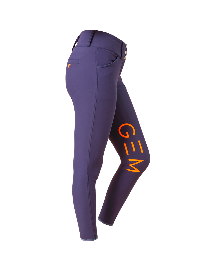 Grips GEM orange à l’intérieur des genoux, E de GEM sur chaque fesse, logo sur le passant arrière de la ceinture.