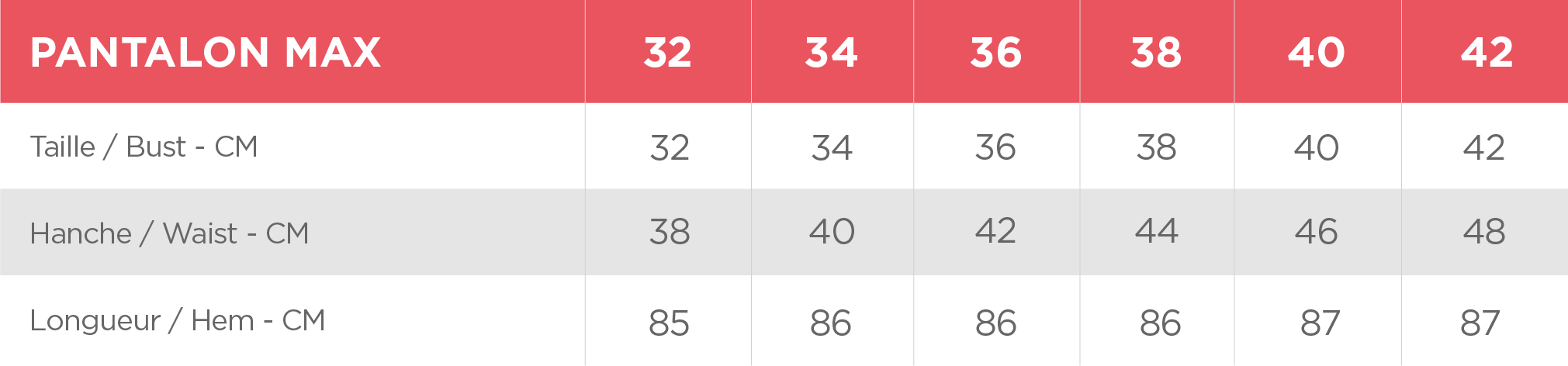 Le pantalon Max taille normalement, nous vous conseillons de prendre votre taille habituelle.