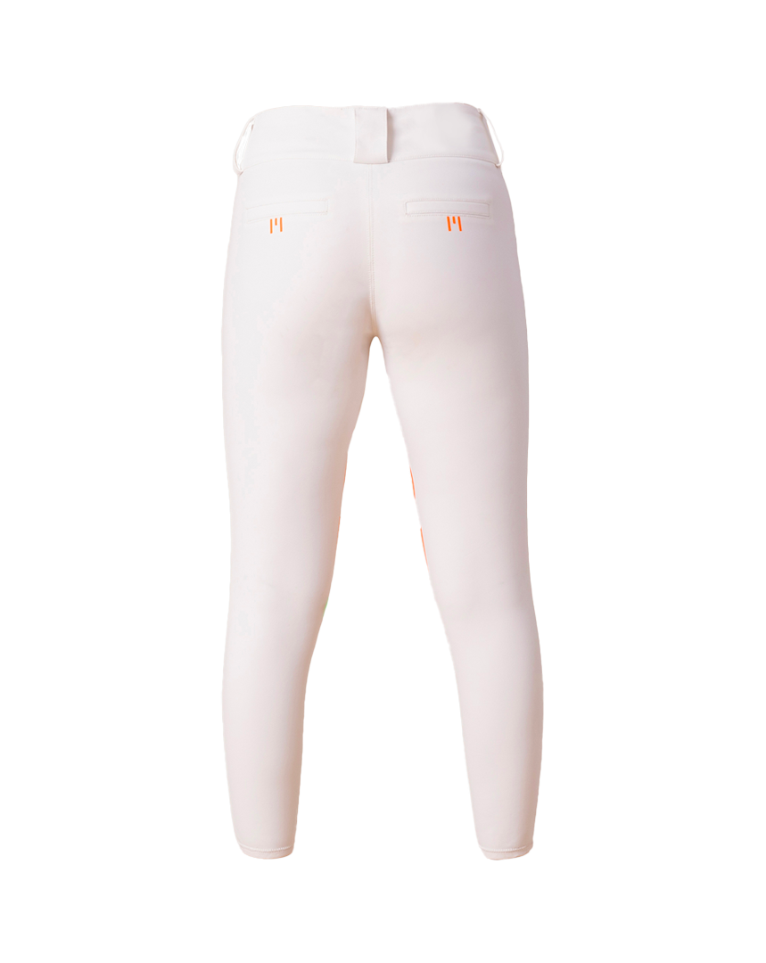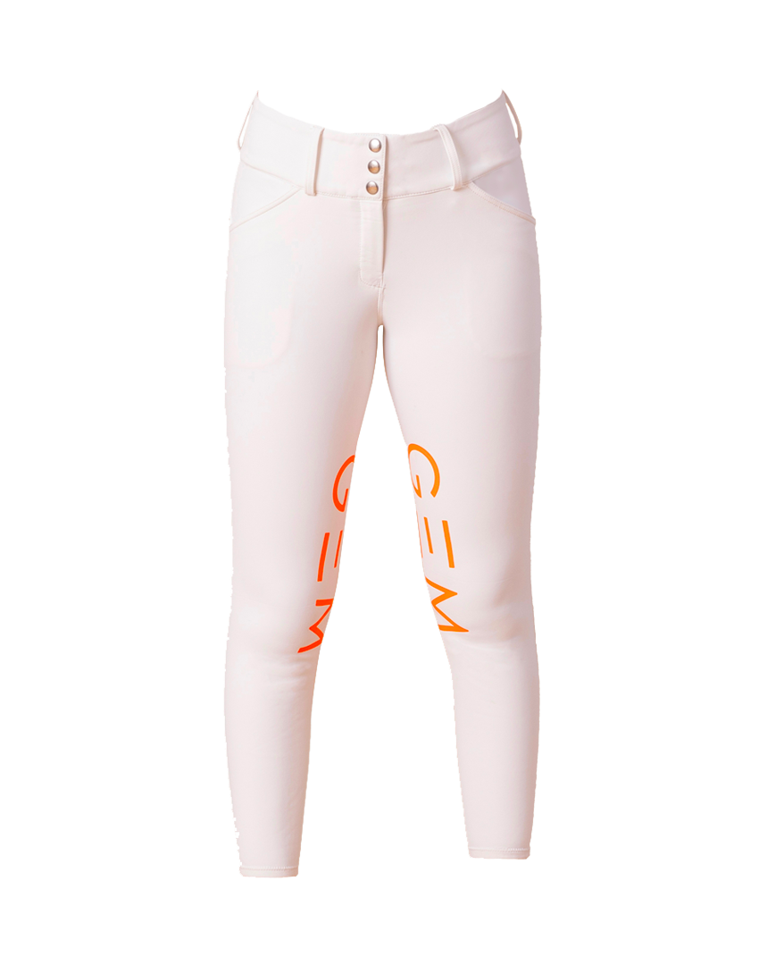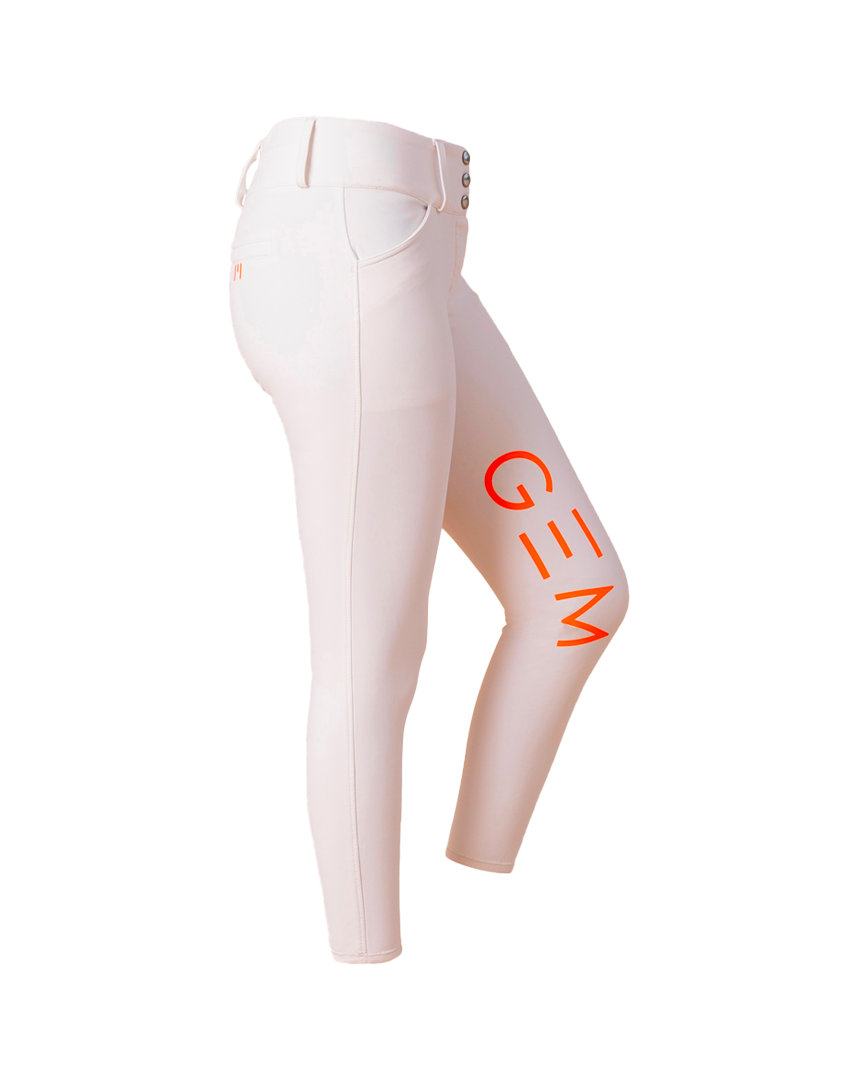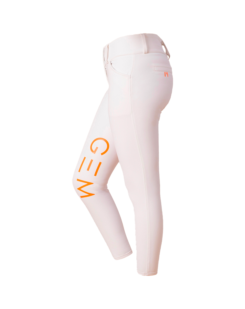 Grips GEM orange à l’intérieur des genoux, E de GEM sur chaque fesse, logo sur le passant arrière de la ceinture.