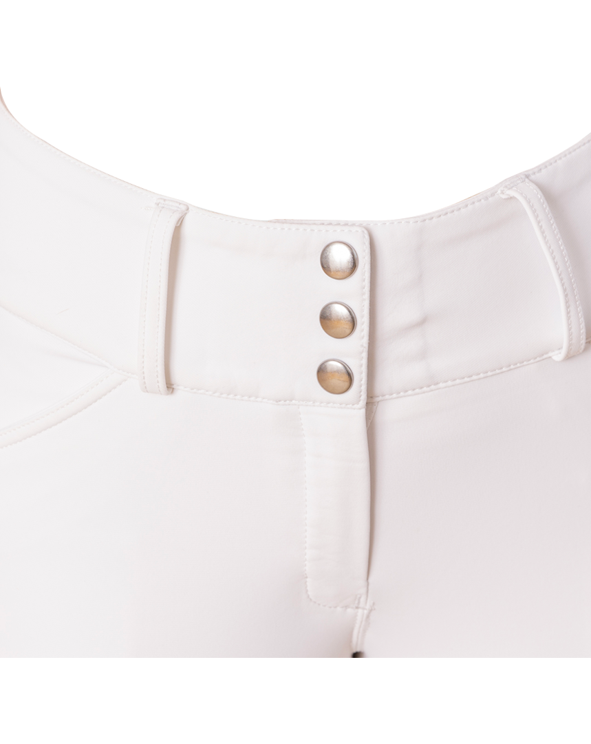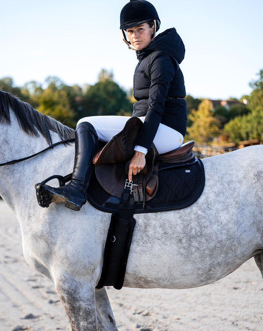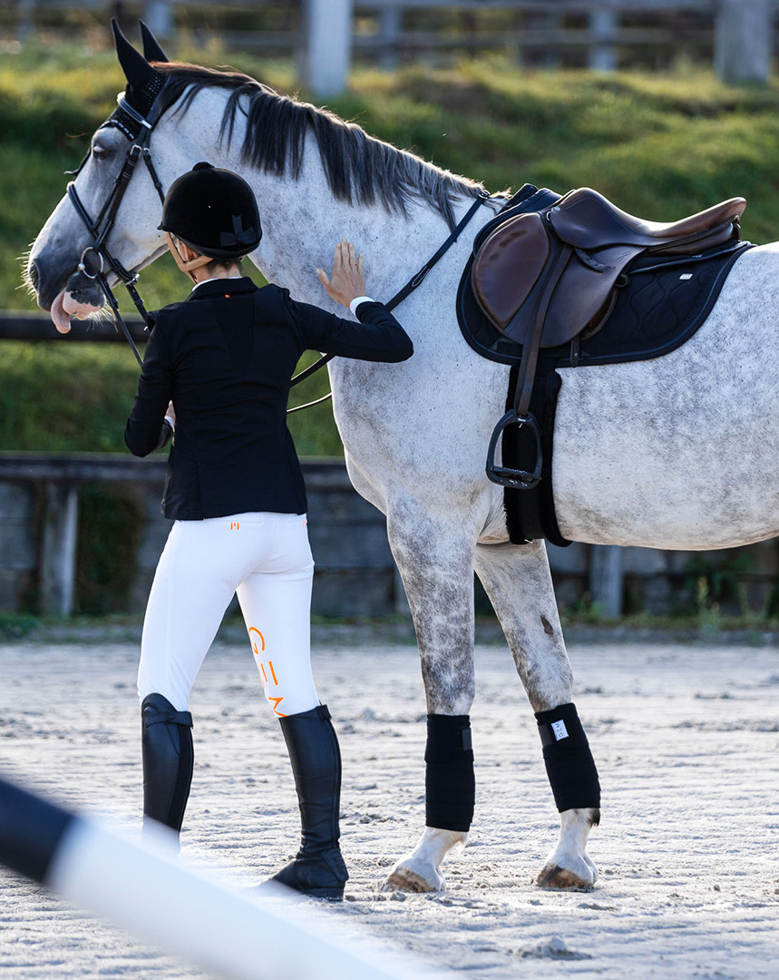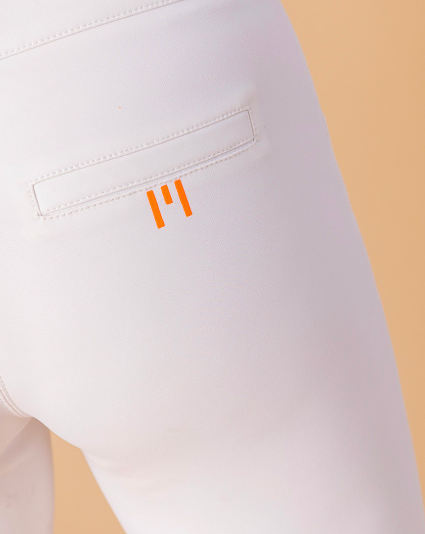 Grips GEM orange à l’intérieur des genoux, E de GEM sur chaque fesse, logo sur le passant arrière de la ceinture.