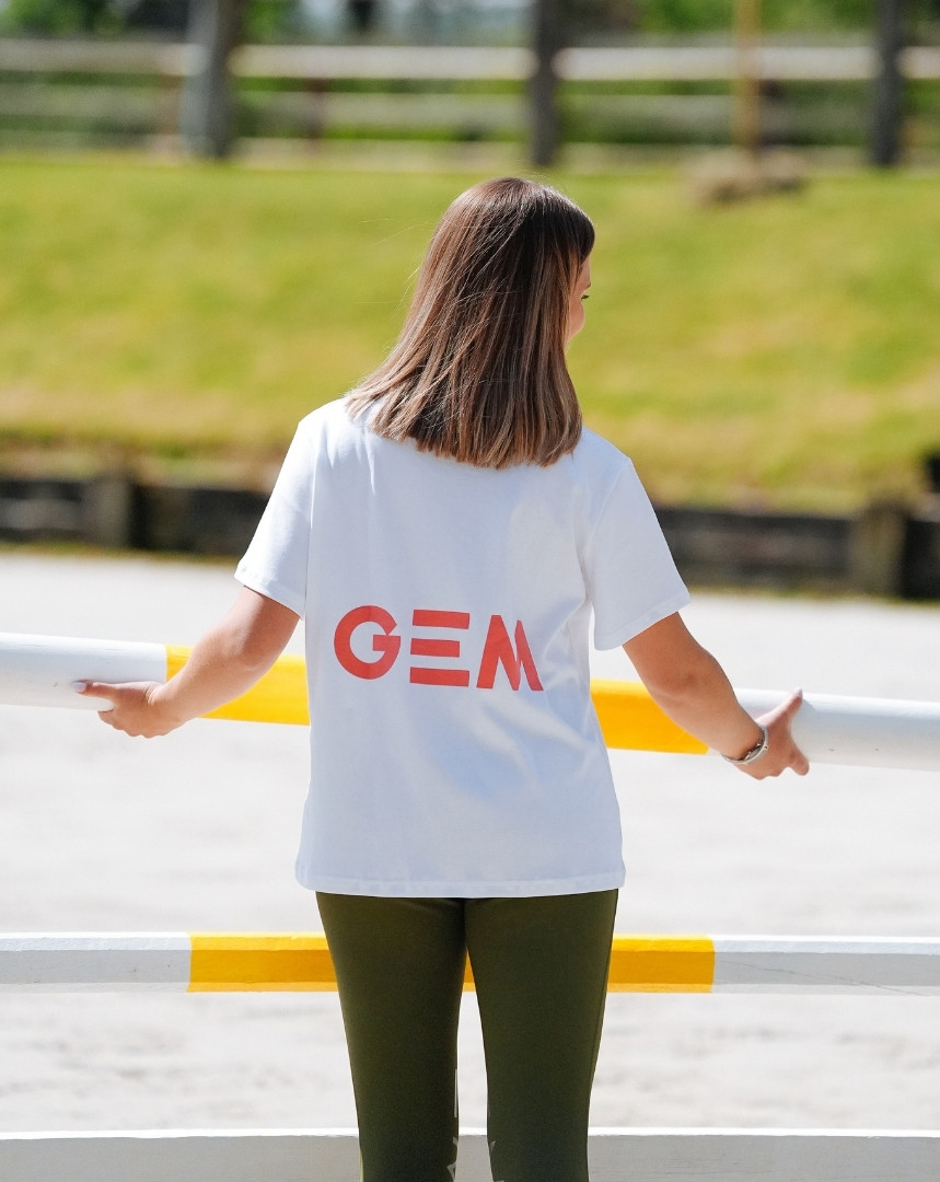 Oversized just the way we like it, featuring a large GEM logo in silver for the black version or in blue/white/red for the white version.